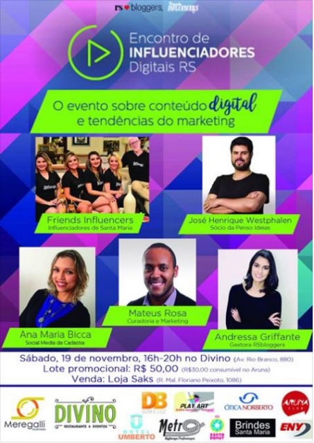 O Encontro de Influenciadores Digitais RS - evento que reúne criadores de conteúdo online, profissionais e estudantes de Marketing e Comunicação - confirma data e local do evento em Santa Maria: dia 19 de novembro, no Divino (Av. Rio Branco, 880 - Santa Maria - RS), das 16h às 20h. Com o objetivo de debater o crescimento e profissionalização dos influenciadores dentro e fora da internet e aproximar marcas e agências digitais deste novo formato de marketing, o Encontro é assinado pela rede RSbloggers.